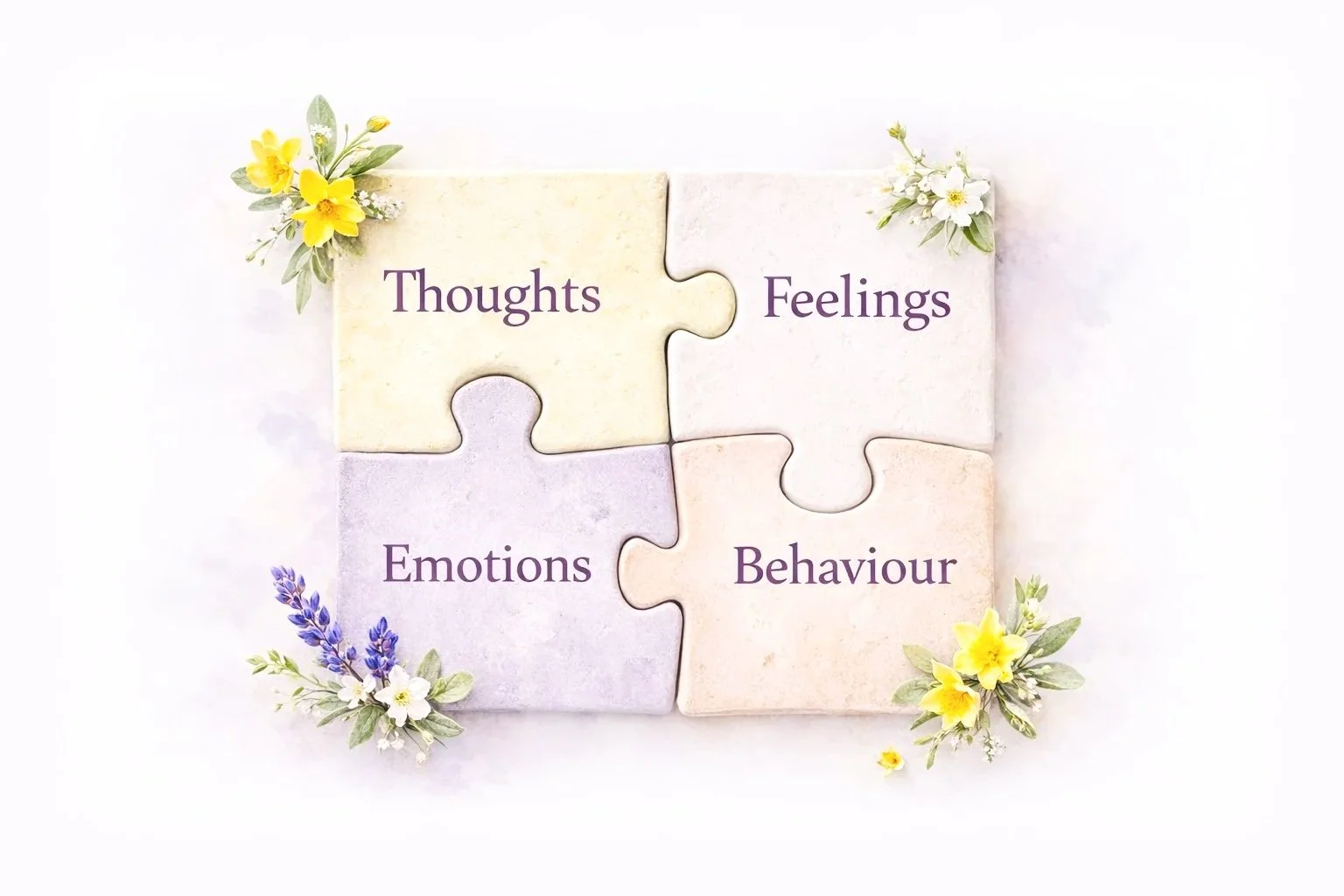 CBT focuses on the links between our thoughts, emotions, behaviours, and physical responses. When life becomes difficult, these patterns can sometimes start to work against us and keep problems going. CBT helps us notice these patterns and develop more helpful ways of responding, so that things can begin to feel more manageable again.